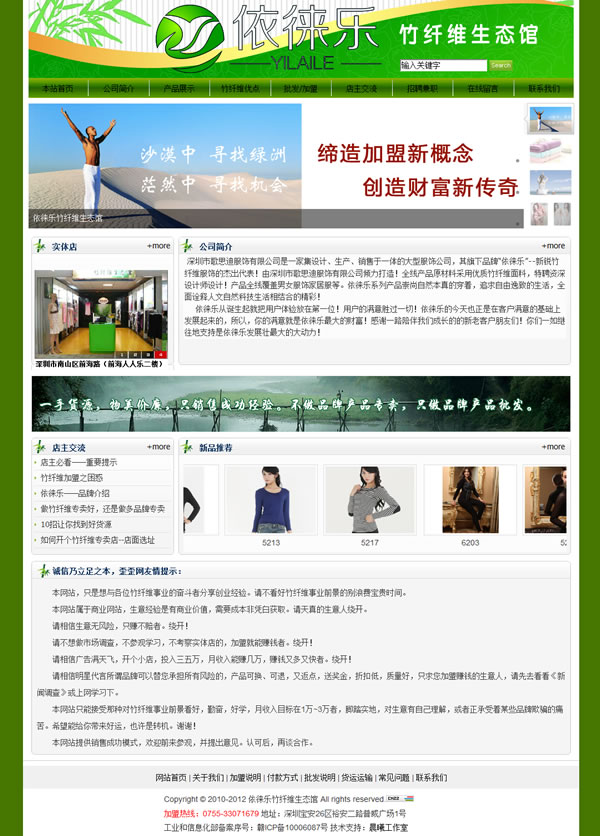 深 圳市歌思迪服饰有限公司是一家集设计、生产、销售于一体的大型服饰公司,其旗下品牌“依徕乐”--新锐竹纤维服饰的杰出代表!由深圳市歌思迪服饰有限公司倾力打造!全线产品原材料采用优质竹纤维面料,特聘资深设计师设计!产品全线覆盖男女服饰家居服等。依徕乐系列产品崇尚自然本真的穿着,追求自由逸致的生活,全面诠释人文自然科技生活相结合的精彩!
